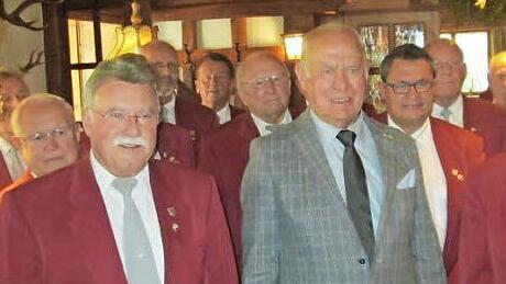 Seinem Ehrenmitglied und langjährigen Sänger Werner Knorr brachte der Gesangverein "Harmonie" Kösten zu seinem 80. Geburtstag im Gasthof Juraschenke in Oberlangheim unter Leitung von Ehrenchorleiter Reinhold Höhn ein Ständchen dar. Vorsitzender Jürgen Thorandt gratulierte für die langjährige Treue und die Arbeit für den Chor sowie den Verein und überreichte ein Geschenk. Im Bild von links: Vorstand Jürgen Thorandt, Jubilar Werner Knorr und Ehrenchorleiter Reinhold Höhn. Im Hintergrund die aktiven Sänger. Foto: Bernd Jakob
