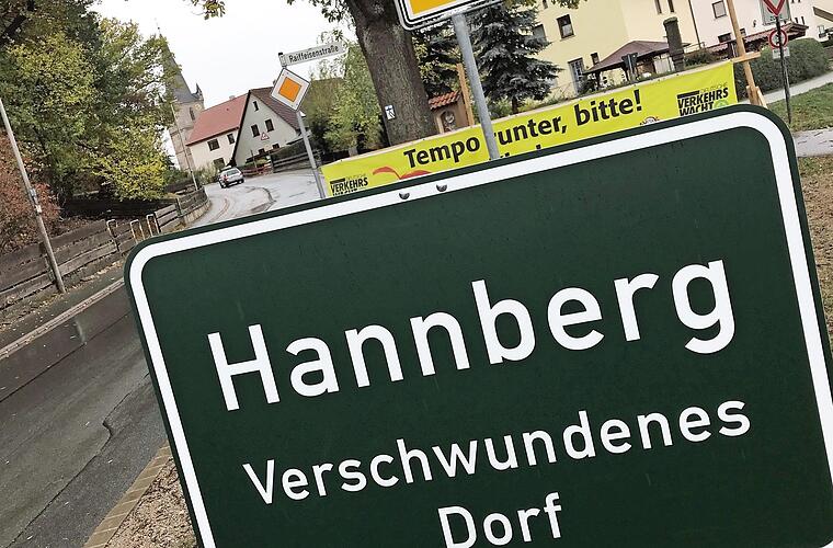 Auf den ersten Blick scheinen es Ortsschilder zu sein. Hannberg, Kosbach und Steudach prangen in großen Lettern auf den Schildern, die sich von den echten Ortsschildern zunächst erst einmal lediglich in der Farbe zu unterscheiden scheinen. Grün statt dem bekanntem Gelb. Und wer genauer hinschaut, sieht, dass der kleinere Schriftzug nicht die Zugehörigkeit zum Landkreis oder der Stadt kennzeichnet; dort steht der Zusatz: "Verschwundenes Dorf".