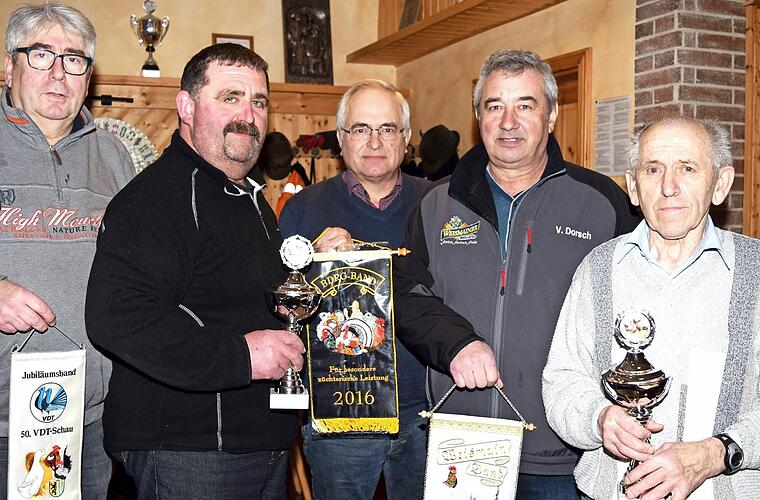 Bei der Jahreshauptversammlung wurden auch die Vereinsmeister ausgezeichnet. Es waren dies Gerhard Popp (Hühner), Vinzenz Dorsch (Tauben), beim Wassergeflügel und den Zwerghühnern Hans Schramm und in der Jugendklasse Michael Tempel (Zwerghühner) und Julian Wieslitzen (Tauben).