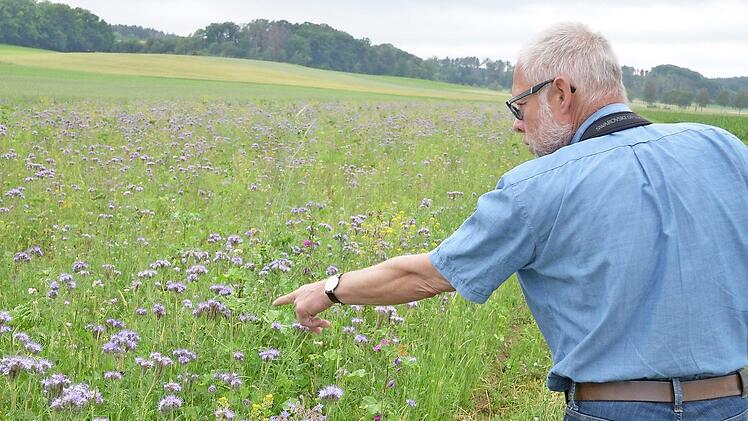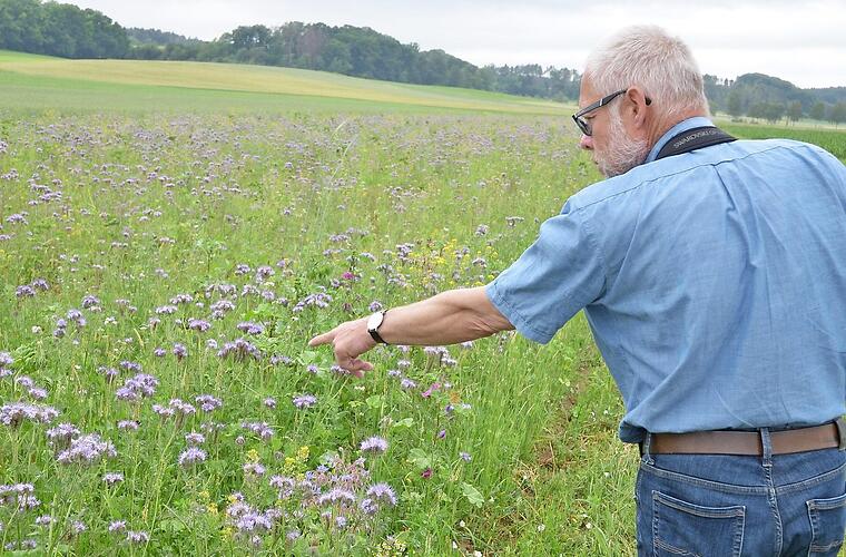 Das zeigt, dass die trockenen Sommer, die das Rebhuhn zu schätzen weiß, alleine nicht reichten, um für verstärkten Zuwachs zu sorgen. Es müssen auch geeignete Lebensräume zur Verfügung stehen, wie sie im Programm geschaffen wurden. Dass die Göttinger Mischung nicht nur dem Rebhuhn nutzt, ist dabei klar. "Von den vielen Blütenpflanzen und der dauernden Deckung profitieren viele Arten", sagt Frank Reißenweber. Ein Blick über die Fläche gibt ihm recht. Zurzeit dominieren die Blüten der Phacelia das Bild. Darüber summt und brummt es munter. Bienen und Hummeln, Schmetterlinge und auch Vögel sind unterwegs. Die Flächen leisten also auch einen bedeutenden Beitrag bei den Bemühungen, dem Rückgang in der Biomasse bei den Insekten entgegenzuwirken.