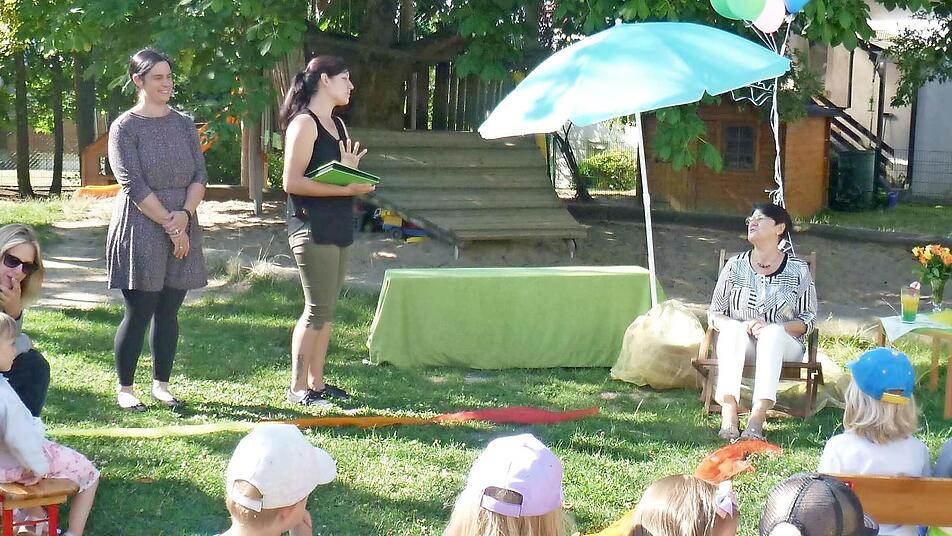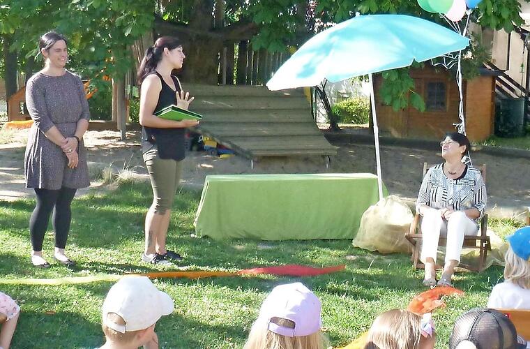 Beate Weiß durfte in einem Liegestuhl unter einem Sonnenschirm Platz nehmen und wurde mit einem Cocktail in Grün-Gelb - die Farben des Hauses Löwenzahn - zum Einstieg in den Ruhestand verwöhnt. Kindergartenkinder und Kolleginnen wünschten ihr singend "Viel Glück und viel Segen auf all deinen Wegen". Passend dazu erhielt Beate Weiß einen "Reisepass ins Glück" für den Eintritt in den Ruhestand.