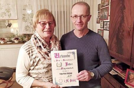 Rosi Glatzer bekam die Ehrennadel in Gold vom 1. FC Pressig für 50-jährige Mitgliedschaft verliehen. Vorsitzender Manfred Müller hielt die Laudatio in einer kleinen Feierstunde für die engagierte Pres...
