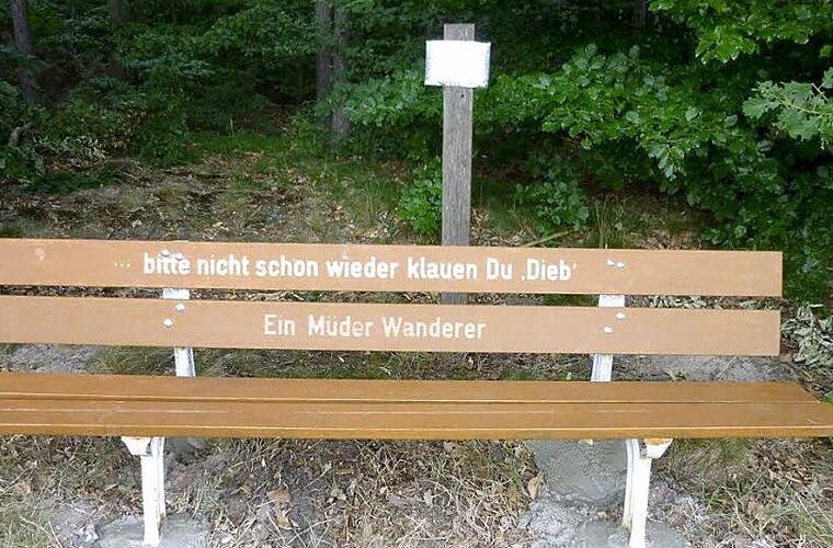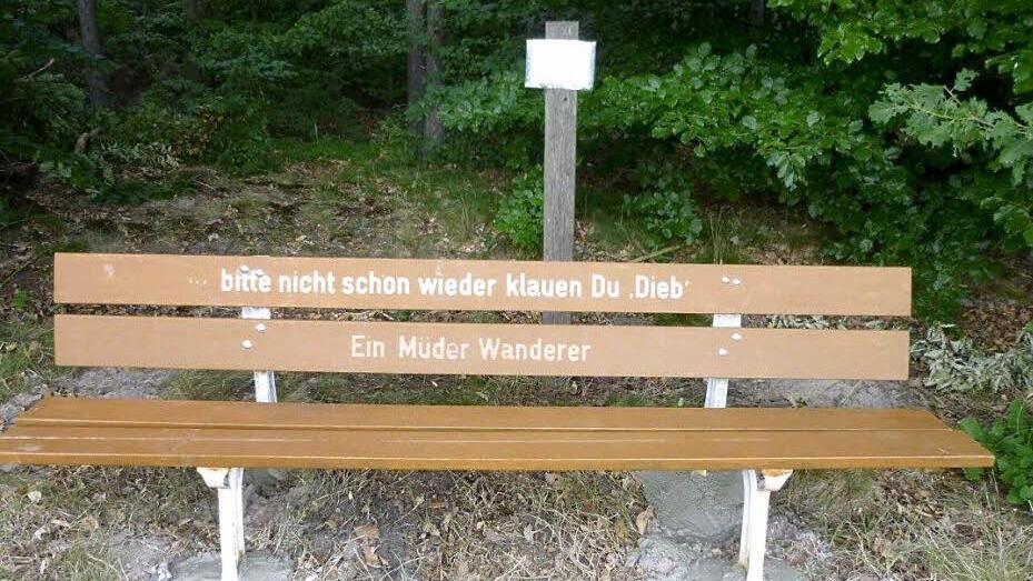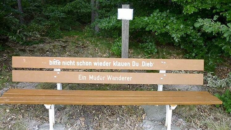 Nachdem ein "müder Wanderer" an der Stelle der geklauten Bank einen verärgerten Brief an den "Bank-Räuber" hinterlassen hatte, nahm Georg Hofmann die Anregung auf und fräste die unmissverständliche Aufforderung in die Lehne: "Bitte nicht schon wieder klauen, Du Dieb". Foto: Sabine Weinbeer