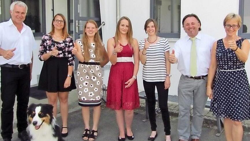 Bad Kissingen, ihre Prüflinge in das Berufsleben. Udo Bischof, Mitglied der Geschäftsführung der GbF und Teamkoordinatorin Angelika Meister, gratulierten gemeinsam mit dem zuständigen Berufsberater der Agentur für Arbeit, Thomas Schlereth, den frisch gebackenen Kauffrauen für Büromanagement, der Fachpraktikerin für Hauswirtschaft und dem Verkäufer zu ihren bestandenen Prüfungen.