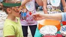 Im Anschluss hatten die Kinder bei einer Spielrunde fünf Spielstationen zu bewältigen, indem sie einen Raupenkopfschmuck und einen Schlüsselanhänger aus Perlen bastelten, einen Reifenparcours absolvierten, gereichte kleine Happen bei verbundenen Augen erschmecken mussten und schließlich die Metamorphose von der Raupe zum Schmetterling nachvollziehen sollten, indem sie in Toilettenpapier eingewickelt durch einen Plastikschlauch krabbelten und dabei ihren "Kokon" abstreiften.