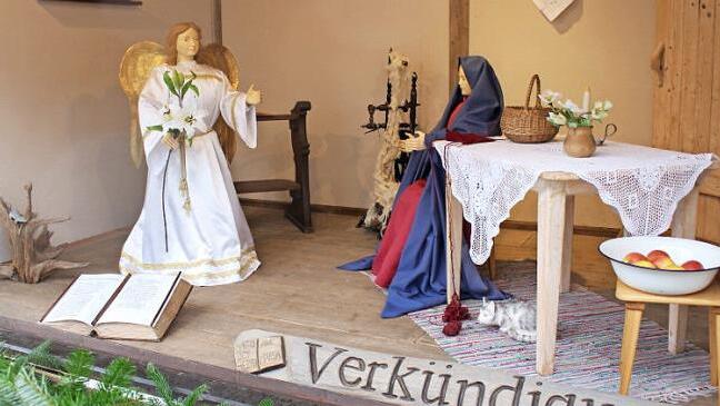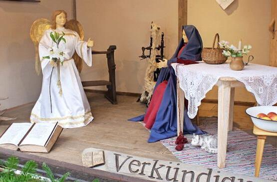 "Wegen Dauerregens" - wie auf einem Aushang zu lesen war - wurde das Fenster der Großkrippe auf dem Schlüsselfelder Marktplatz nicht wie sonst festlich geöffnet. In den Vorjahren war der Kindergarten dabei, die Blaskapelle spielte und die Pfarrer beider Konfessionen sprachen besinnliche Worte. Die Krippe auf dem Marktplatz ist eine von vielen auf dem Schlüsselfelder Krippenweg. Ab dem ersten Advent ist die Verkündigungsszene durch den Engel Gabriel dargestellt. Liebevoll hat der Krippenverein das Fenster gestaltet: Ein altes Spinnrad und eine Schüssel mit Äpfel zieren die Stube, in der Maria den Worten des Engels lauscht. In einem Nebenraum ist Josef an der Werkbank zu sehen. Foto: Evi Seeger