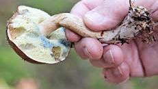 Zu Krautblatters Bedauern ist die Zeit des Maronenröhrlings schon vorbei. Man erkennt ihn an der Blaufärbung der Röhren. Wieder ein Tipp vom Experten: immer nur festfleischige Pilze ernten. Ist der Stiel weich, sollte man sie stehen lassen, denn sie bilden Sporen und sorgen so für ihre Verbreitung. Der Sammler sollte auch in "Pilzecken" nicht so viel herumtrampeln.