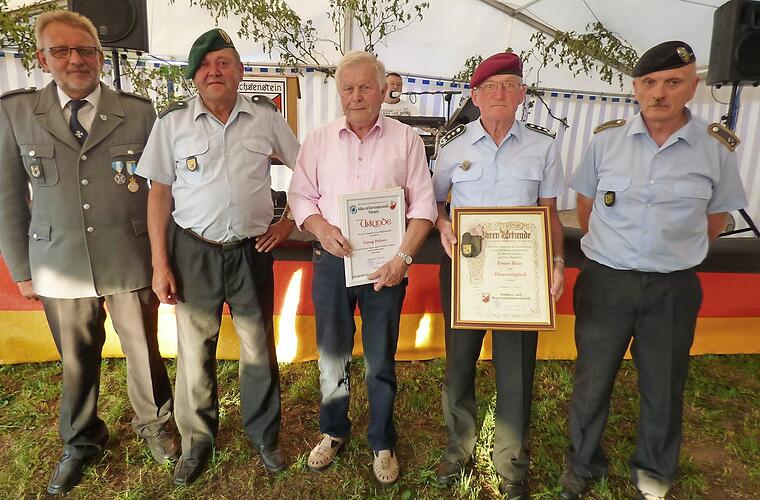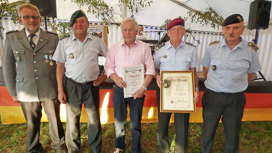 Im Rahmen der 110-Jahr-Feier der Soldaten- und Reservistenkameradschaft Wichsenstein hat Vorsitzender Gerhard Freier zusammen mit Ehrenvorsitzendem Michael Hutzler Oberst i. R. Erwin Reus zum neuen Ehrenmitglied des Vereins ernannt. Reus, der im Zivilberuf Schulleiter war und dessen Vorfahren aus Pottenstein stammen, freute sich sehr.