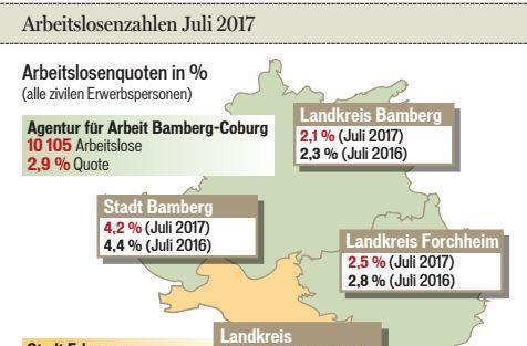 Trotz des jahreszeitlich bedingt leichten Anstiegs der Beschäftigungslosigkeit blieb die Arbeitslosenquote im Agenturbezirk Bamberg-Coburg im Juli unverändert bei 2,9 Prozent. Sie liegt damit deutlich unter dem Vorjahreswert von 3,3 Prozent. Das gilt gemeinhin als Vollbeschäftigung.