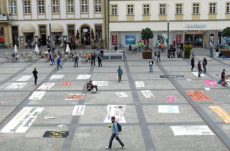 Böen fegen über den Maxplatz und machen es den Leuten schwer. Mit Klebeband befestigen sie Transparente und Banner mit einigem Abstand auf den steinernen Quadraten des Platzes vor dem Rathaus. Gut 50 Stück kommen zusammen.