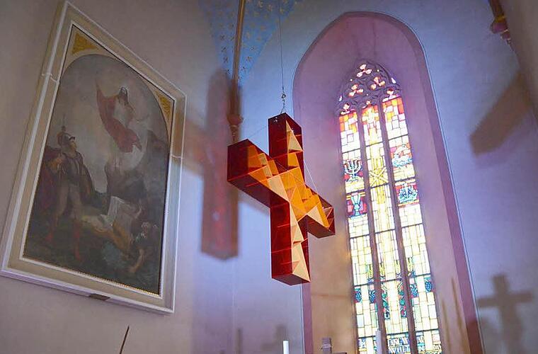 Spuren aus Licht sollen zum Pilgern auf Luthers Wegen in die Kirchen der Region einladen, die am Lutherweg liegen. In der Stadtkirche St. Georg in Neustadt zieht ein orangerot schimmerndes Kreuz die Blicke auf sich.