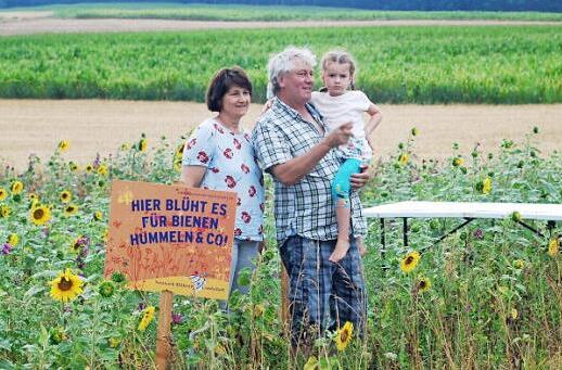 Die Bezeichnung scheint nicht übertrieben, denn auf dem Prechtel'schen Blühpatenfeld summt und brummt und duftet es. Nicht nur Bienen schwirren geschäftig umher, ebenso Wespen, verschiedene Hummeln, Schmetterlinge und weitere Flugkünstler. Zwischen den auffälligen Sonnenblumen wächst ein gutes Dutzend heimischer Blumen und Kräuter, darunter kräftig lilafarbene Malven, gelbe Ringelblumen, Kornblumen, Klee, Dill, Senf und Buchweizen.