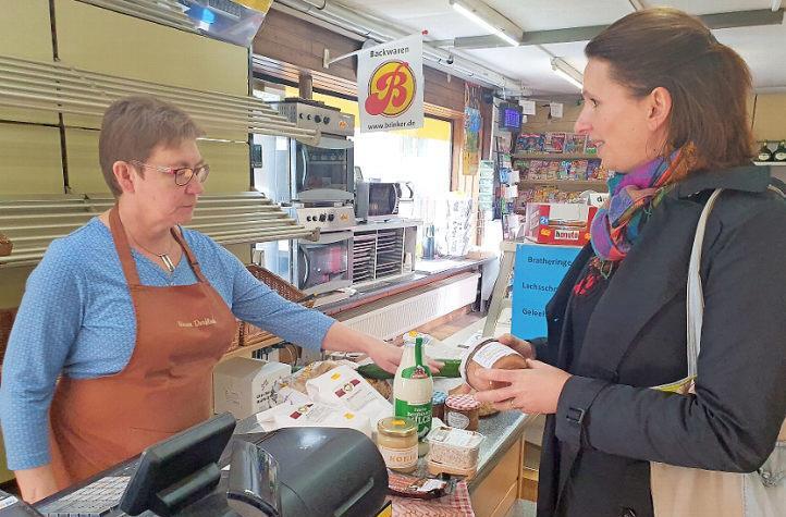 Der Einkauf geht weiter. Die Regio-Testerin entscheidet sich für Wurst aus Steinleins Hofladen in Zochenreuth und geräucherte Bratwürste von der Metzgerei Lindner, ebenfalls Zochenreuth. "Ich kaufe nicht jeden Tag ein, sondern bündle das. Außerdem haben wir hier ein Frauennetzwerk. Da bringen wir uns Sachen mit, wenn eine von uns unterwegs ist", erzählt Brauer und nimmt sich Dinkel- und Sauerteigbrot vom Mühlenhof Fleischmann aus Buttenheim. "Das wird noch im richtigen Holzofen gebacken", ergänzt die Ladenbesitzerin.