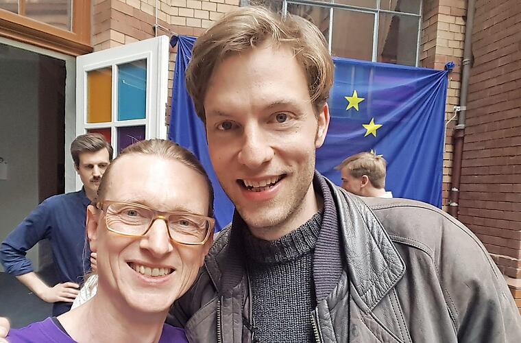 Hans-Günter Brünker, Volt-Kandidat aus der Stadt Bamberg, in der die Partei auf 1,3 Prozent kam, verfolgt die Wahlergebnisse mit seinen Parteikollegen in Berlin. Brünker ist guten Mutes: "Ein Sitz hört sich wenig an, aber es ist ein riesiger Erfolg für eine so junge Partei." Wichtig sei laut Brünker nun, dass Volt den Sitz auch als Plattform für die Öffentlichkeit nutzt. "Viele Wähler sind erst in der letzten Woche auf uns aufmerksam geworden." Noch im Zug von Bamberg nach Berlin habe Brünker Mitgliedsanträge für die Partei bearbeitet. makl