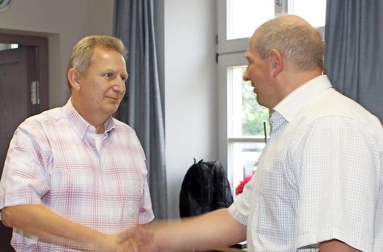 Ludwig Hagensick (l.), Nachfolger auf der Liste der CSU für die aus gesundheitlichen Gründen zurückgetretene Gemeinderätin Claudia Greim, wurde vor der Gemeinderatssitzung durch Bürgermeister Klaus Fa...