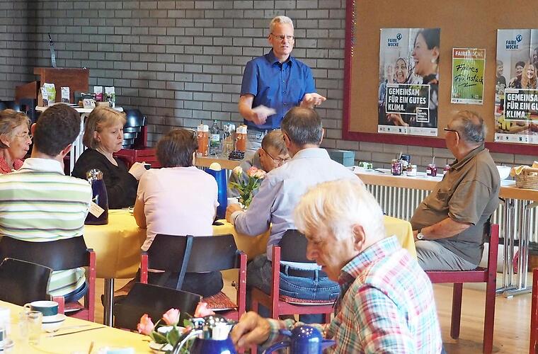 Anlässlich der "Fairen Woche(n)", die noch bis 24. September bundesweit andauern, lud der Weltladen Bad Kissingen seine Kunden zum Auftakt zu einem "Fairen Frühstück" ein. Rund 25 Gäste, darunter Martha Müller als Vertreterin des Stadtrats, trafen sich im Evangelischen Gemeindezentrum und wurden von Charlotte Fries, der Vorsitzenden des Eine-Welt-Vereins Bad Kissingen begrüßt und auf das Motto "Gemeinsam für ein gutes Klima" eingestimmt. Anschließend wurde das Frühstücksbuffet mit Vorstellung der verwendeten Zutaten aus "Fairem Handel" und Erläuterung der Rezepte durch Bianca Key vom Weltladen-Team eröffnet. Neben süßen und herzhaften Brotaufstrichen, Avocado- und Quinoa-Salaten waren Kaffeespezialitäten und Kakaoschalentee kulinarische Höhepunkte. Oliver Key, Schriftführer des Eine-Welt-Vereins, hob die Bedeutung des Fairen Handels für die Stabilisierung eines globalen guten Klimas hervor und verdeutlichte die Zusammenhänge zwischen Klimaveränderung und den Arbeitsbedingungen der Kleinbauern in den Erzeugerländern. Die anschließende Diskussion bestätigte die Aktualität des Themas und zeigte Möglichkeiten auf, den Fairen Handel in der "Fair-Trade-Town" Bad Kissingen zu unterstützen. red