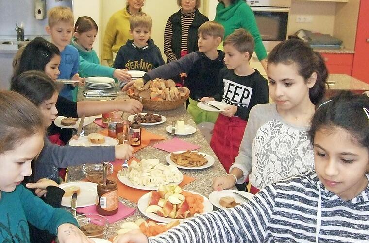 Bei der Klasse 3b schauten auch Schulleiter Oskar Holzmann mit Bürgermeister Ludwig Wahl (FW) vorbei und beide konnten sich vom guten Kenntnisstand der Schüler über Fair Trade überzeugen. Nun waren die Kinder an der Reihe und zerkleinerten die Möhren, Äpfel und Bananen unter der Aufsicht von den weiteren Helferinnen Irma Richter, Christa Eberle und Ulrike Frank.