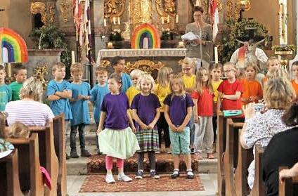 Ein Gottesdienst mit Pfarrer Martin Wissel in der Pfarrkirche stand unter dem Motto: "So bunt wie ein Regenbogen ist unser Leben" und der Geschichte vom "Farbenstreit". Darin ging es darum, dass jeder einzigartig ist in seiner Art und ein friedliches Zusammenleben aller die beste Lösung ist. Mit den T-Shirts in den Farben des Regenbogens ausgestattet, bildeten dann alle Vorschulkinder einen Regenbogen vor dem Altar. Anschließend fand im Kindergarten für alle ein Fest statt.