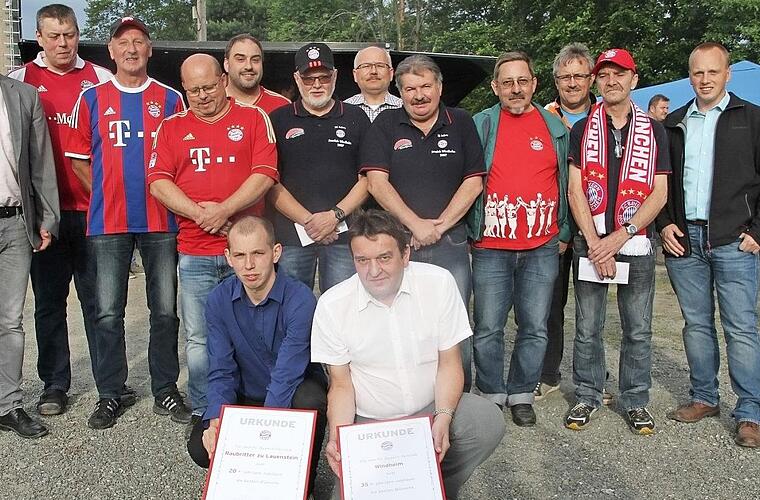 Es ist ein Novum. Zum ersten Mal feierten am Wochenende zwei Bayern-Fan-Clubs gemeinsam ihre Jubiläen. Der FC-Bayern-Fanclub "Raubritter Lauenstein" konnte auf 20 Jahre, der FC-Bayern-Fan-Club Windheim auf 35 Jahre seit der Vereinsgründung zurückblicken. Das Fest wurde mit einem Ehrungsabend, einem Kleinfeld- und Jugendturnier auf dem Sportgelände des 1. FC Lauenstein gefeiert. Es gab auch zwei Schirmherren, nämlich den Ludwigsstädter Bürgermeister Timo Ehrhardt und seinen Steinbacher Kollege, Thomas Löffler.