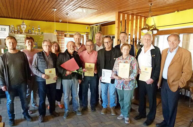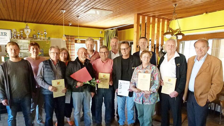 Die Vereins- und BLSV-Ehrungen mittels Urkunde und wohlwollenden Laudationes nahmen vor Erster Vorsitzender Günther Schaller, Zweiter Vorsitzender Julian Scheler, Bürgermeister Marco Steiner, stellvertretender BLSV-Kreisvorsitzender Eberhard Fröbel und die Ehrenamtsbeauftragte Christa Wiedermann für 25 Jahre an Heiko Fliege, Stefan Mußgiller, Jürgen Präcklein; für 40 Jahre an Christian Barthel, Thomas Bauer, Michael Faber, Liselotte Schaller, Frank Schremmer, Angela Wenzel, Udo Ostermeier, Horst Weingarth, Georg Herfert, Dieter Hein; für 50 an Jahre Manfred Hopf, Helmut Leicht, Willfried Faber, Bernd Münekhoff. dav