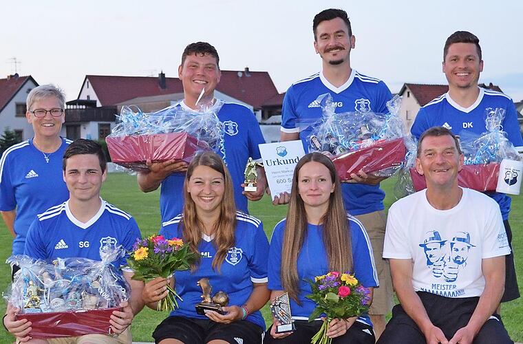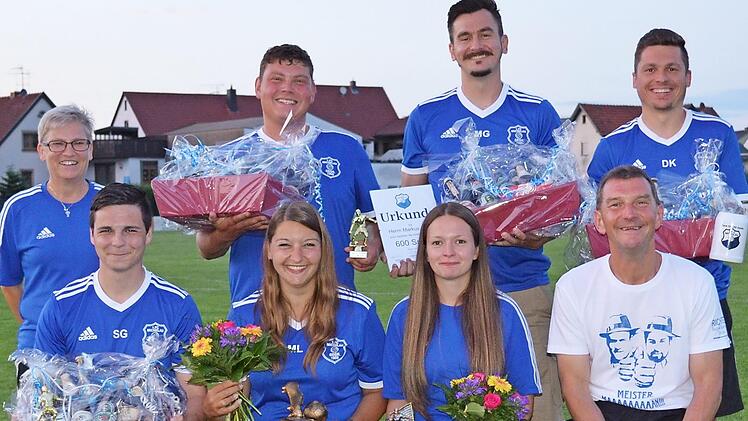Zum Saisonabschluss bei den Fußballern des FC Michelau haben Vorsitzender Gerd Bergmann und Frauenspielleiterin Sigrid Horn einige Aktive für ihren fußballerischen Einsatz und Clubtreue geehrt. Unser Bild zeigt (stehend von links): Frauenspielleiterin Sigrid Horn, Lukas Bergmann (100 Spiele), Markus Gagel (600), Daniel Köhlerschmidt (200); (sitzend, v. l.) Sandro Gmell (100), Melanie Lother (200), Nadine Panzer (100) und Vorsitzenden Gerd Bergmann. Auf dem Bild fehlt Tobias Gahn (200). Foto: Carmen Schmitt