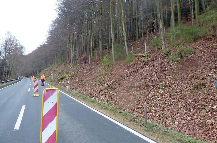 Die B 470 ist in diesem Bereich halbseitig mit einer Ampelanlage gesperrt. Im Auftrag des Staatlichen Bauamts Bamberg werden die sogenannten Felsberäumungsarbeiten an den steinschlaggefährdeten Hängen der Bundesstraße ausgeführt. Die Arbeiten sollen laut einem Arbeiter, der auf der B 470 die Maßnahme absichert, noch bis Dienstag nächster Woche andauern. tw