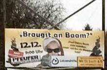 Vielleicht leben auch die Gosberger nach irgendeinem anderen Kalender, denn noch immer weist am Ortseingang ein großes Banner auf eine Christbaumaktion hin, die am 12. Dezember zugunsten eines guten Zwecks stattfand. In großen Lettern steht dort: " Braugst an Baam?"