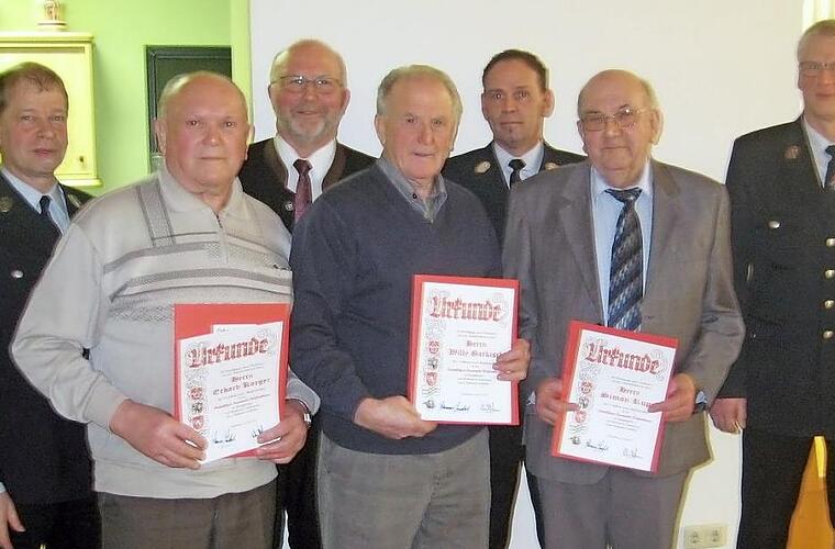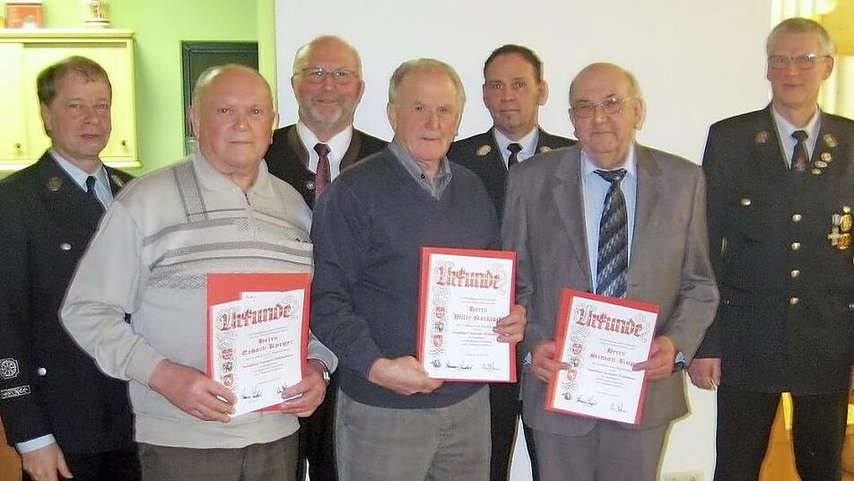 Bürgermeister Egon Herrmann zeigte sich erfreut über das ehrenamtliche Engagement in der Feuerwehr. Er lobte die gute Zusammenarbeit und den guten Zusammenhalt unter den Vereinen. Er nahm zusammen mit Vorsitzendem Christian Höfner die Ehrungen vor. Es wurden geehrt: Für 65 Jahre Erhard Korger. Für 60 Jahre Rudolf Volk, Simon Rupp, Willy Garkisch und Horst Schmidt. Für 50 Jahre Werner Müller. Für 25 Jahre Gerhard Tenner, Marcus Feulner, Mark Elflein.