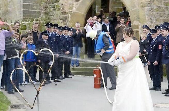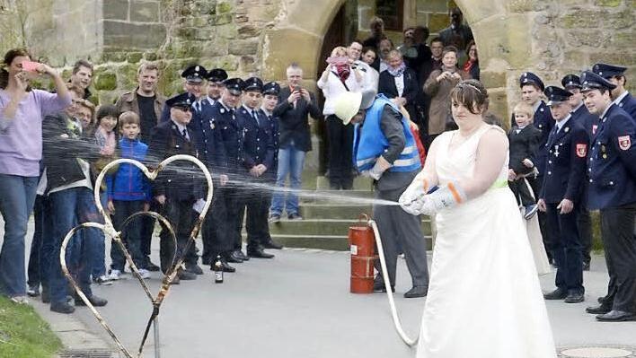 Nach der Trauung erwartete die Frischvermählten ein Spalier der Feuerwehrleute aus Schimmendorf, deren Kommandant der Bräutigam seit acht Jahren ist. Vorsitzender Helmut Pistor gratulierte zur Hochzeit, und das Paar musste Feuerwehr-Grundkenntnisse demonstrieren: