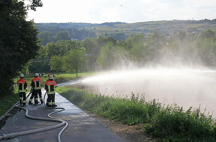 Bei dem fiktiven Brand einer Biogasanlage wurde angenommen, dass schon einige Feuerwehren vor Ort seien und eine große Menge Löschwasser benötigt werde. Deshalb pumpten die Feuerwehrleute das Löschwasser aus der Itz. Dafür waren circa 800 Meter Schlauch und vier Pumpen erforderlich.