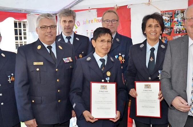 Die Freiwillige Feuerwehr Burkersdorf feierte mehrere Jubiläen und führte Ehrungen durch. Die Damen- und die Kinderfeuerwehr standen dabei im Mittelpunkt, sie blicken auf 25 beziehungsweise zehn Jahre ihres Bestehens zurück. Der weitere Stellvertreter des Landrats, Bernd Steger, und Kreisbrandinspektor (KBI) Matthias Schuhbäck zeichneten mit Urkunden und dem staatlichen Ehrenzeichen des Freistaates Bayern Elke Bernhard und Bianca Ströbele für 25 Jahre aktiven Dienst in der Feuerwehr aus.