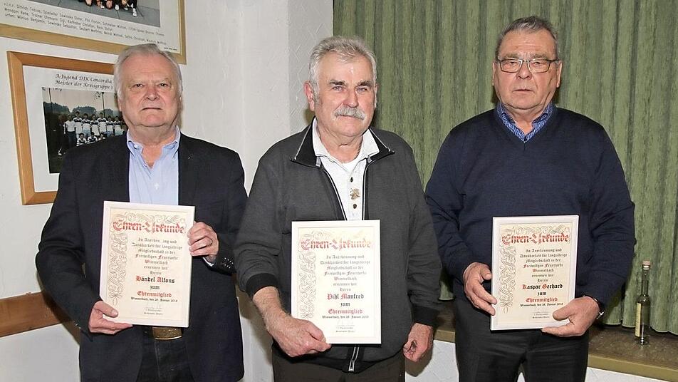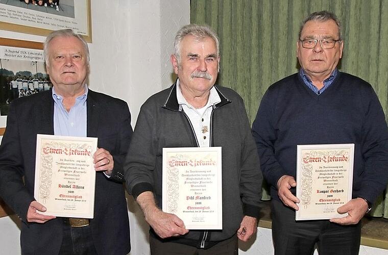 Die Freiwillige Feuerwehr Wimmelbach hat drei neue Ehrenmitglieder. Vorsitzender Dieter Sawinsky und sein Stellvertreter Sebastian Trautner überreichten an Alfons Händel, Manfred Pihl und Gerhard Kaspar die Ernennungsurkunden.