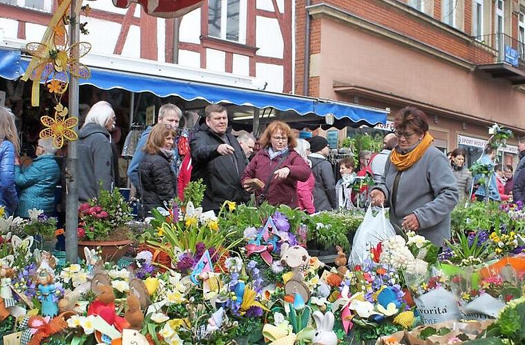 Manche nutzten die Möglichkeit, sich eine Woche vor Ostern mit Dekorationsartikeln und Blumen für das höchste Fest des Christentums einzudecken. Das Angebot war vielseitig, dementsprechend gefüllt waren die Wege zwischen den Ständen am Paradeplatz. Die Fußgängerzone wurde über die Nürnbergerstraße bis zur Ecke Schönborn- und Luitpoldstraße erweitert.