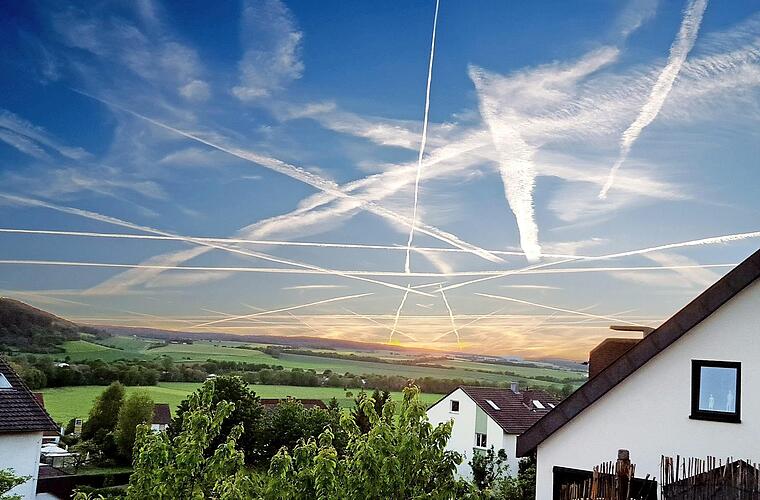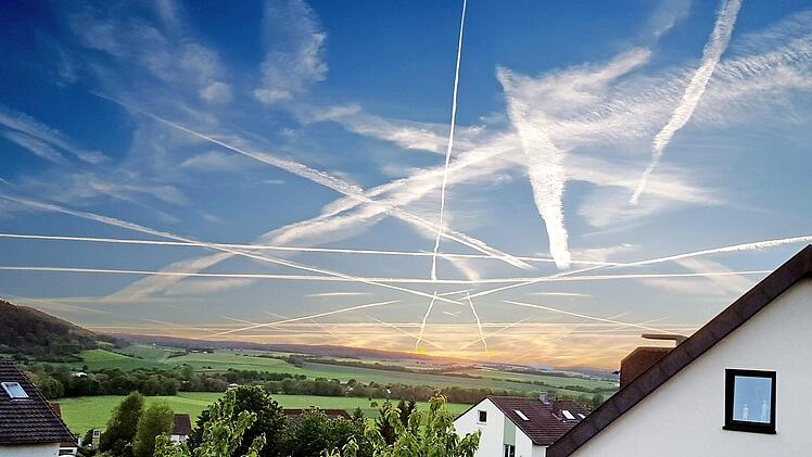 Blick von der Zent in die Rhön: Bei entsprechender Wetterlage bleiben die Kondensstreifen der Flugzeuge, die den Luftraum über Münnerstadt kreuzen, lange erhalten. Bei Sonnenuntergang gibt es dann sol...