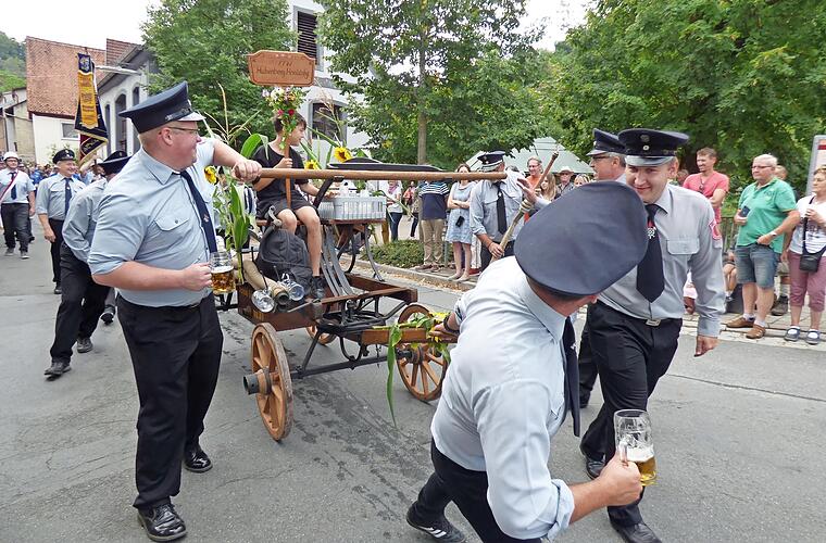 Ebenfalls mit von der Partie die Waischenfelder Burgmadla, die heuer ihr 50-jähriges Jubiläum feiern können. Sie fuhren auf einem Wagen, auf dem der Steinerne Beutel – das Wahrzeichen der Stadt – zu sehen war. Originell waren auch zwei Festzugsteilnehmerinnen in fränkischer Tracht, die einen Leiterwegen mit Kindern hinter sich herzogen.