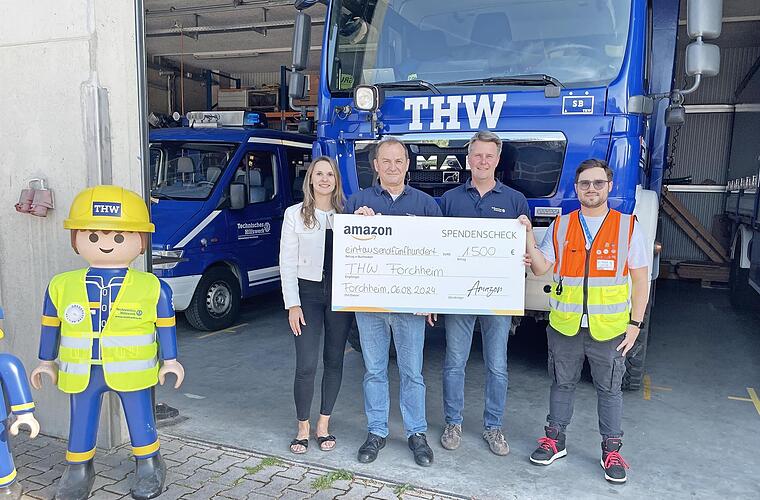 Bei einer Führung informierten sich Sandra Heusinger ( Amazon Associate Partner) und Raphael Heck ( Amazon Operations Manager ) über die Arbeit und die Ausstattung des Technischen Hilfswerks ( THW ). Der Vorsitzende des Vereins der Helfer und Förderer des THW Forchheim , Dieter Wölfel, und Ortsbeauftragter Christian Wilfling freuten sich anschließend über einen Spendenscheck über 1500 Euro. Amazon Eggolsheim unterstützt regelmäßig lokale Organisationen mit Spenden und will so ein guter Nachbar sein, wie in einer Pressemitteilung erklärt wurde. red