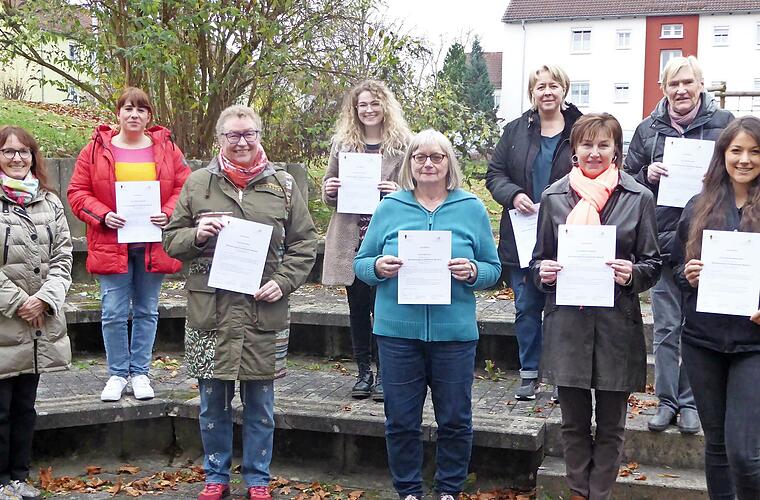 „Durch die Pandemie gab es für mich immer weniger Anlässe, das Haus zu verlassen. Ich habe richtig abgebaut und habe nun Angst vor Stürzen.“ Solche Sätze hören Kathrin Reif, die Leiterin des Bürgerzentrum-Mehrgenerationenhauses, und Melanie Schneider vom neuen Katharinenspital von der älteren Generation immer häufiger. Deshalb haben sie an zwei Wochenenden acht Bewegungsbegleiterinnen ausgebildet. Fabiola Reges-Huber vermittelte die Übungen nach dem Otago-Programm zur Sturzvorbeugung und schärfte den Blick auf die häuslichen Stolperfallen.