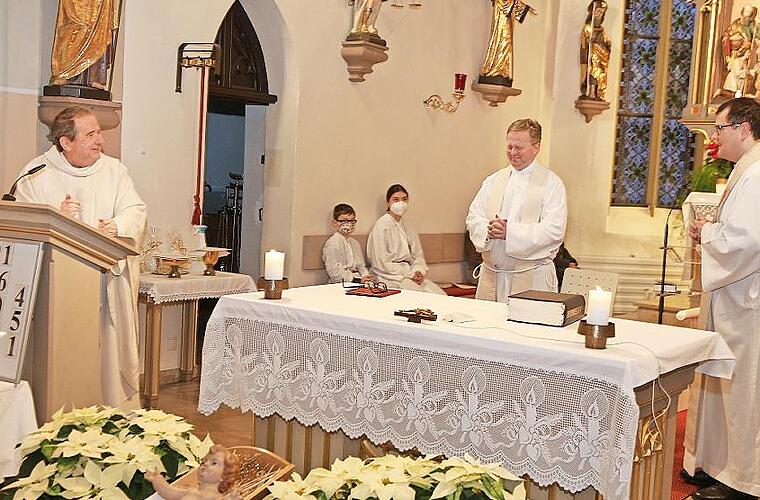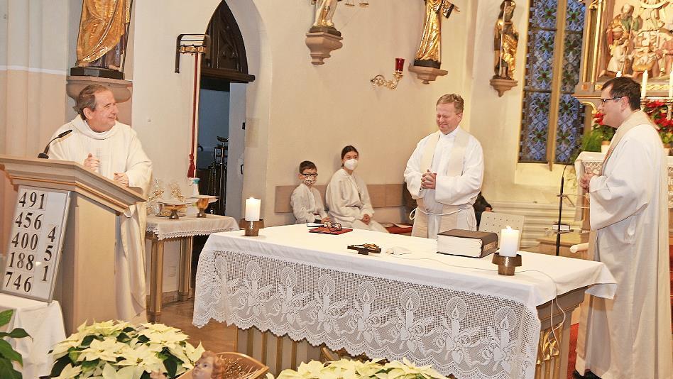 Treffend wählte Beißer die Lesung aus dem 1. Buch der Könige, wo Elija den Elischa salbte und den Mantel überwarf, der ihm dann spontan als Prophet und Diener folgte. Sinnbildlich erfolgte die Übergabe der Dienste nach diesem alttestamentlichen Ritus.  Pfarrer  Florian Stark zeigte den  Kirchenbesuchern  zunächst eine Urkunde von  Erzbischof  Schick, wonach er mit Wirkung 1. Januar 2022 zum Pfarradministrator der  Pfarreien   Leutenbach  und Weingarts-Regensberg ernannt worden ist.