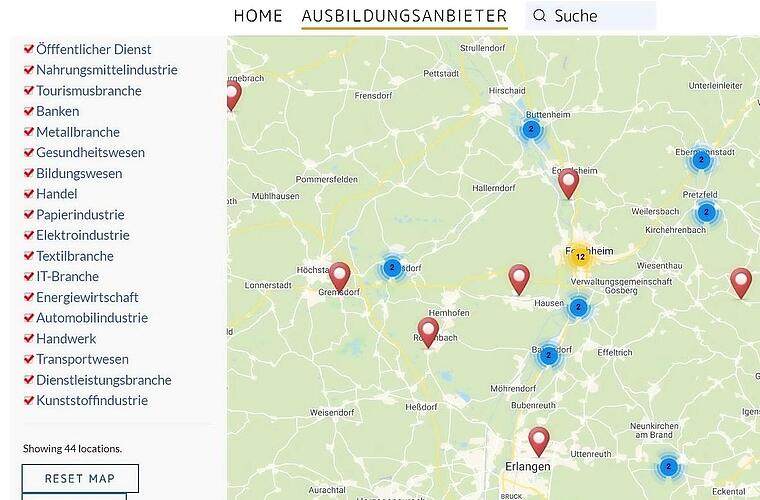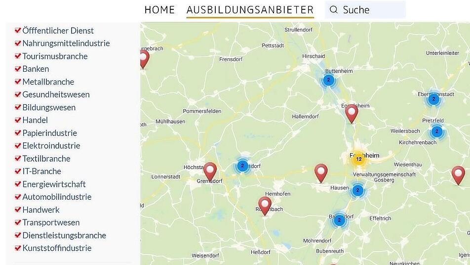 Der einfachste Zugang ist über die interaktive Karte auf berufsinfomesse-forchheim.de. Auf ihr erscheinen die Standorte von Firmen und Handwerksbetrieben aus der Region, je nachdem welche Branchen man eingegeben hat. Von dort aus kann man sich leicht auf die Anbieterseiten durchklicken, die alle gleich aufgebaut sind und die wesentliche Merkmale eines Berufes und der Ausbildung aufzeigen.