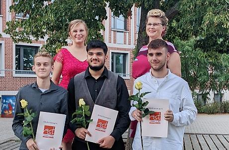 32 Schülerinnen und Schüler holen schließlich ihre Zeugnisse ab. Die besten drei Plätze belegen drei junge Männer – eine Überraschung angesichts der Tatsache, dass bei den Schulabschlüssen meistens junge Frauen die Nasen vorn haben. Munzur Korkmaz, Jamian Adler und Lukas Neubauer sind stolz auf ihre Leistungen.