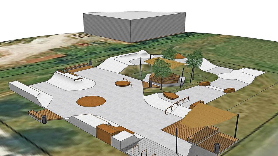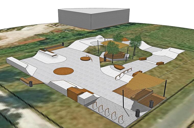 Auf einem 1768 Quadratmeter großen Gelände, das ans Sportgelände angrenzt, soll der Entwurf umgesetzt werden: Rampen, kleine Halfpipes (Halbröhren), befahrbare Treppengeländer, Vertiefungen, eine "Bowle" (Schüssel), Sonnensegel und Sitzmöglichkeiten. Da lacht das Skaterherz. Noch ist das allerdings nicht real, sondern nur planerische Theorie.