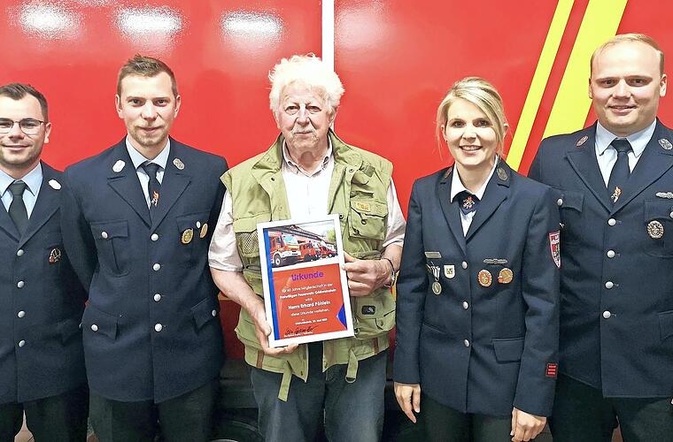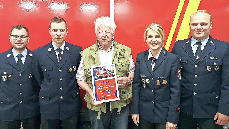 Im Feuerwehrhaus hielt die Stützpunktfeuerwehr Gößweinstein ihre Dienst- und Hauptversammlung ab. Eine besondere Ehrung erhielt dabei Ehrenmitglied Erhard Pöhlein, dem die Vorsitzende Elisa Egelseer-Bogner für 60-jährige Vereinsmitgliedschaft dankte.