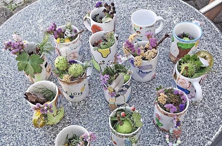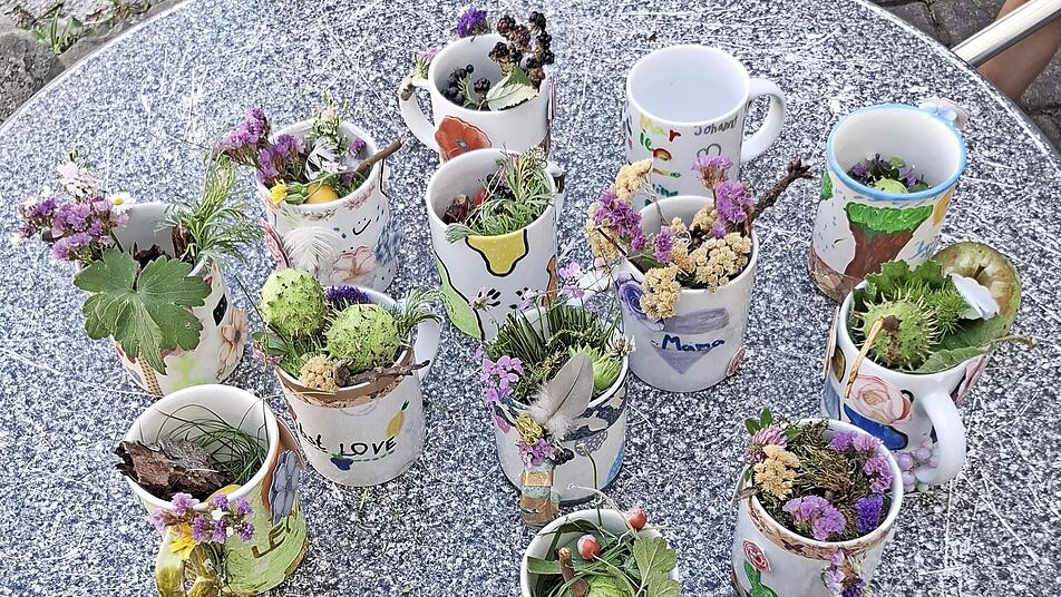 Dabei gingen die Kinder zunächst gemeinsam über Feld und Flur und sammelten brauchbare Naturmaterialien wie Blüten, Blätter, Rinden und Moose. Danach wurden Tassen kreativ bemalt und diese dann fantasievoll dekoriert. Dabei entstanden richtige Kunstwerke, die die kleinen Künstler am Ende mit nach Hause nehmen durften. Zum Abschluss der gelungenen Veranstaltung gab es für alle Beteiligten von der Hausherrin eine kleine Brotzeit und dazu naturbelassenen Apfelsaft aus eigenen Streuobstwiesen. Edwin Rank