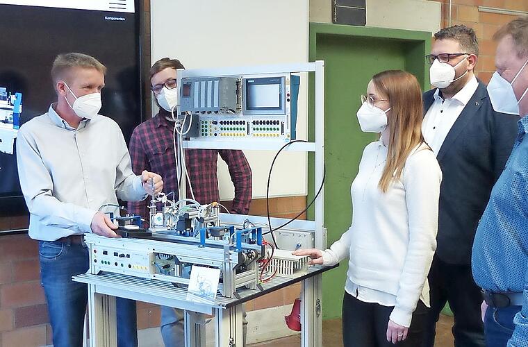 Anhand einer Modellmaschine, die Gefäße verschließen kann und je nach Inhalt die Farbe der Deckel auswählt, stellte Sturany vor, was ein Lehrling in der Berufsschule lernt. Als Erstes, dass die Abläufe der Maschine per App online zu verfolgen sind – in 3D, so dass man alles von allen Seiten beobachten kann. Das gehört zum Ausbildungsziel „Fertigungsprozesse steuern“. Inbetriebnahme und Betriebsabläufe sind ein weiterer Schwerpunkt.