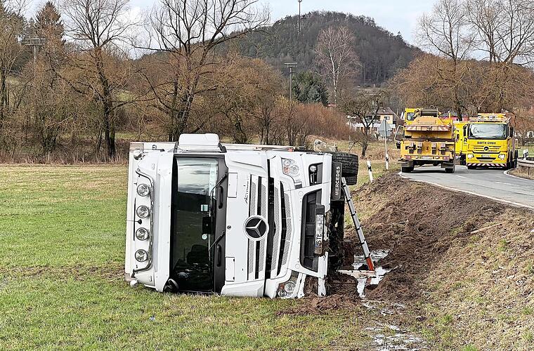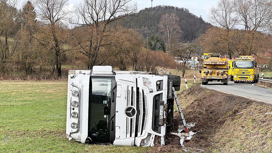 Am Vormittag fuhr ein 26-Jähriger mit seinem Laster von Unterleinleiter in Richtung Ebermannstadt, als ihm ein weiterer Lkw entgegenkam. Beim Ausweichen orientierte sich der 26-Jährige zu weit nach rechts und kam ins Bankett.