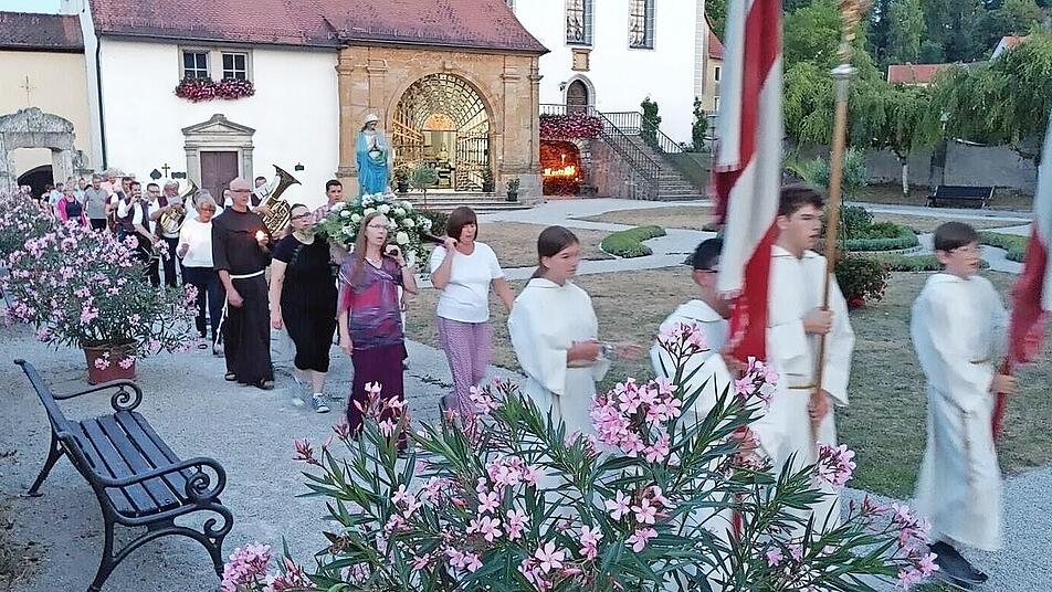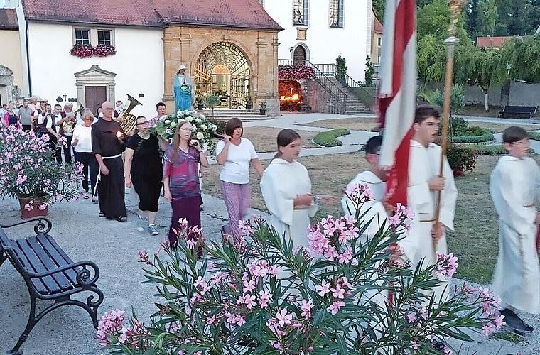 „Ganz im Zeichen des Hochfestes der Aufnahme Mariens in den Himmel “ sollte Gößweinstein entsprechend der Einladung von Pfarrer Pater Ludwig Mazur stehen. Viele waren dieser Einladung gefolgt und so zog am Vorabend des Hochfests eine lange Lichterprozession angeführt von den Ministranten durch Gößweinstein . Der Musikverein Gößweinstein unter Leitung seines Vorsitzenden Thomas Müller begleitete das Singen während der Prozession an den teils mit Fahnen geschmückten Häusern vorbei. Der Gesang, die Gebete, die Kerzenlichter in der abendlichen Dämmerung erzeugten eine wohltuende Stimmung. Dies war wohl der Grund, weshalb sich auch Gäste der Prozession anschlossen.