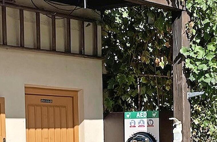 Der Defibrillator ist öffentlich zugänglich am Glockenhaus angebracht.