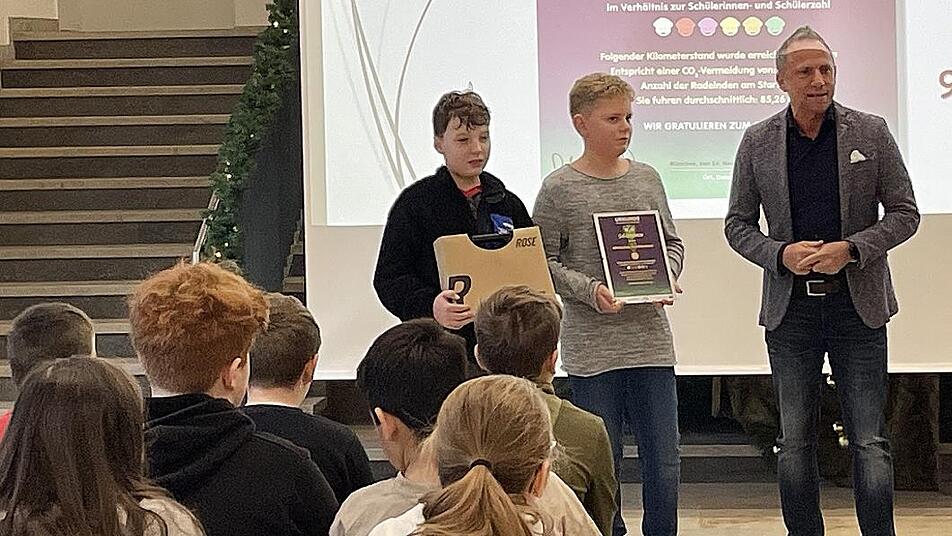 Hoher Besuch in der Aula der Grund- und Mittelschule Kirchehrenbach : Thorsten Glauber , bayerischer Staatsminister für Umwelt und Verbraucherschutz, würdigte die Leistungen der Schule beim bayernweiten Schulradeln 2025.