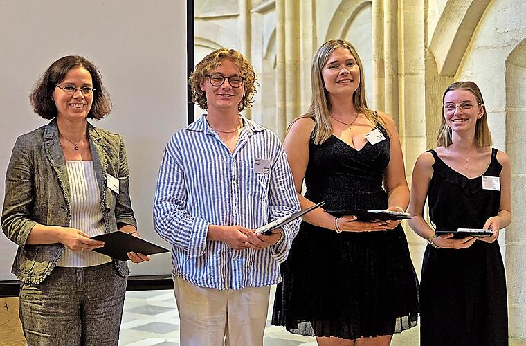 Die Leiterin des P-Seminars, Stefanie Kraus, mit drei Seminarteilnehmerinnen bei der Preisverleihung.