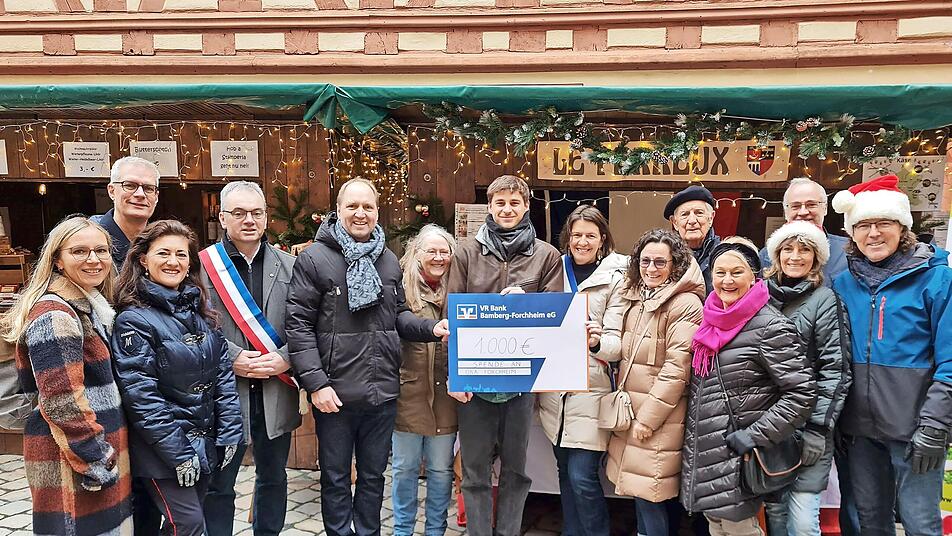 Den Dank der Stadt Forchheim überbrachten Partnerschaftsbeauftragter und Stadtrat Ulrich Schürr zusammen mit Oberbürgermeister Uwe Kirschstein und der Vertreterin des Tourismusmanagements, Stephanie Endres. Gemeinsam mit der Delegation aus Frankreich überreichten sie einen Scheck über einen Betrag von 1000 Euro an die offene Behindertenarbeit Forchheim (Oba), vertreten durch Andrea Hofmann und David Knauer. red